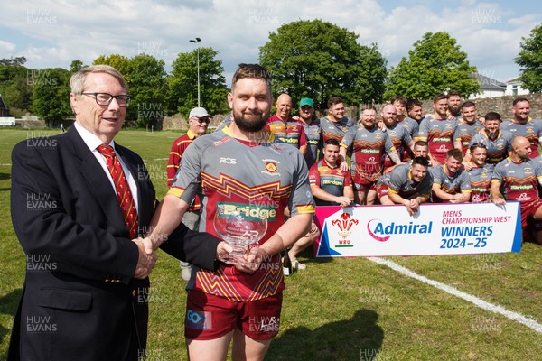 100525 - Llanelli Wanderers v Gorseinon - Admiral Championship West - WRU representative Chris Jones presents the trophy to Llanelli Wanderers captain Rhodri Owens